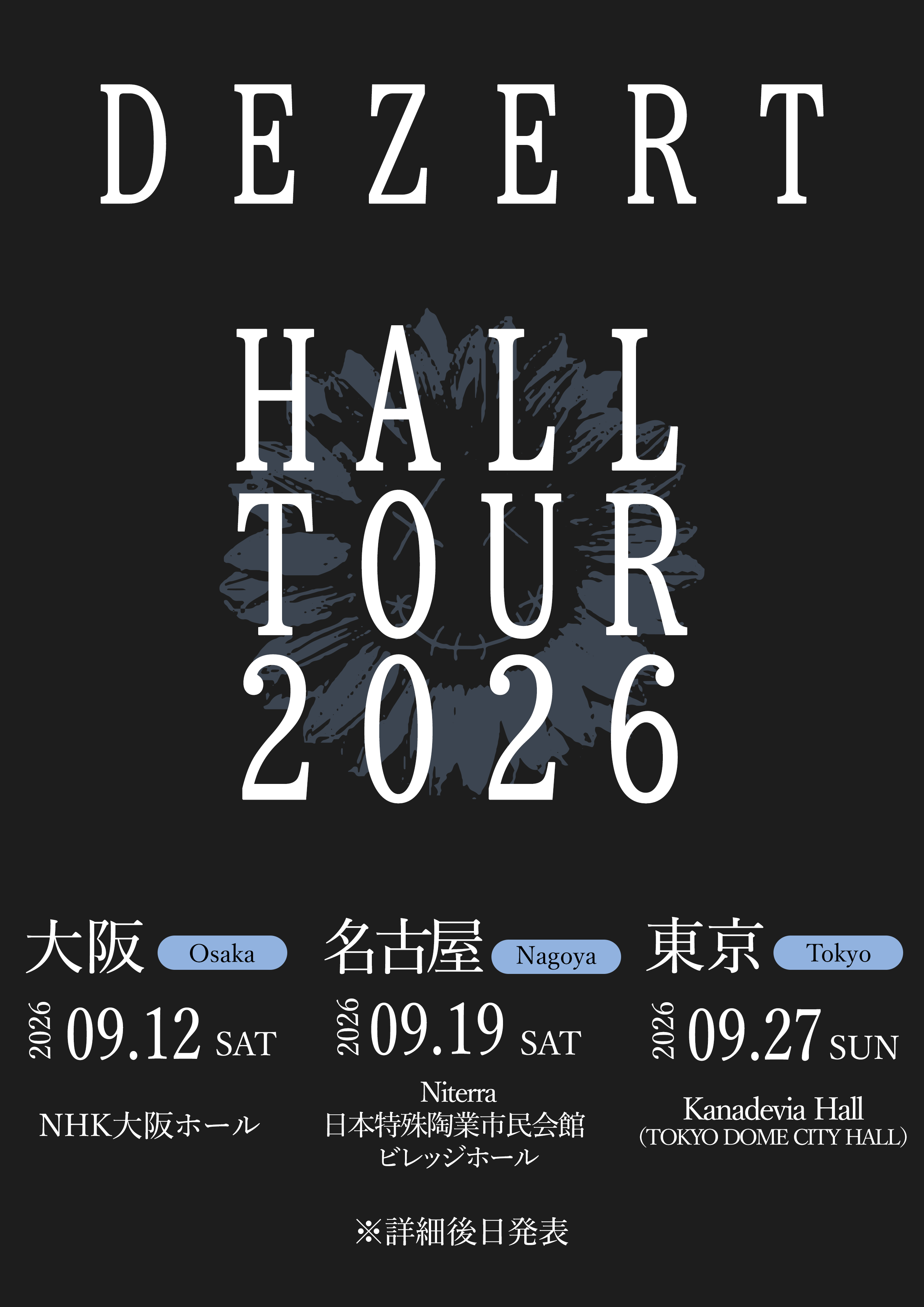 2026年9月12日(土) 大阪:NHK大阪ホール2026年9月19日(土) 愛知:Niterra日本特殊陶業市民会館 ビレッジホール2026年9月27日(日) 東京:Kanadevia Hall(TOKYO DOME CITY HALL)※詳細後日発表